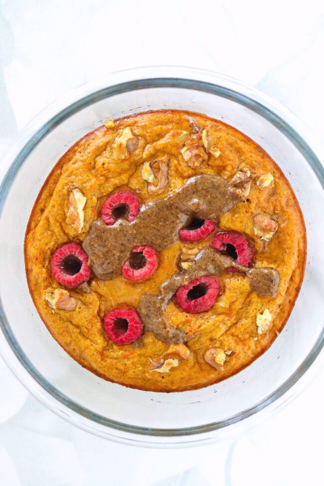 - Toppings (optional): I love topping this carrot cake protein pancake with fresh raspberries and walnuts. You can add any fresh or frozen berries, raisins, or nuts and/or seeds you love. I prefer to bake the toppings with the pancake but you could also add them on top of the pancake after baking.
