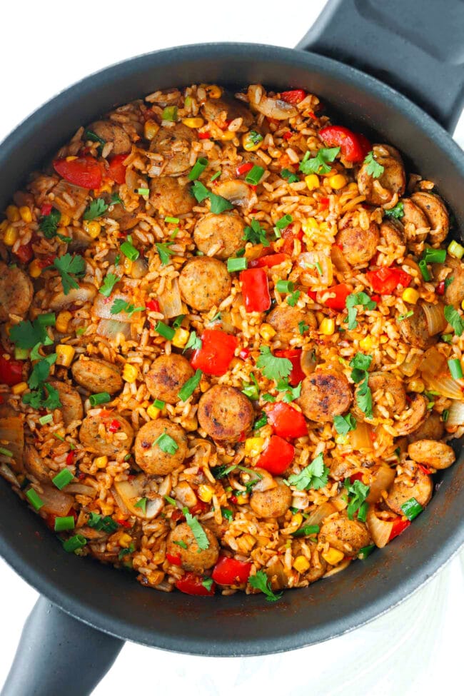 My favorite thing about this chicken sausage with rice skillet is that it’s super flexible and customizable and made with basic, staple ingredients. You can throw in any veggies you have on hand, use white rice if you prefer and also use any type of fully cooked chicken sausage or smoked sausage you love.