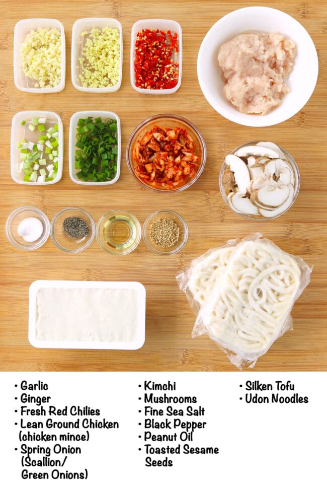 - Prepare all the fresh ingredients: Prepare the spring onion, garlic, ginger, fresh red chilies (if using), mushrooms and kimchi as indicated in the ‘ingredients’ section.
