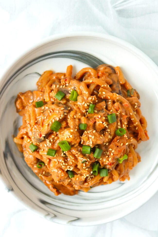 Spicy Korean-style ground chicken, tangy kimchi, mushrooms, chewy udon noodles, and a delectable creamy sauce made from silken tofu come together in this easy high protein dinner! Ready in 30 minutes and packed with flavor, these Creamy Kimchi Chicken Udon Noodles are perfect for busy weeknights!